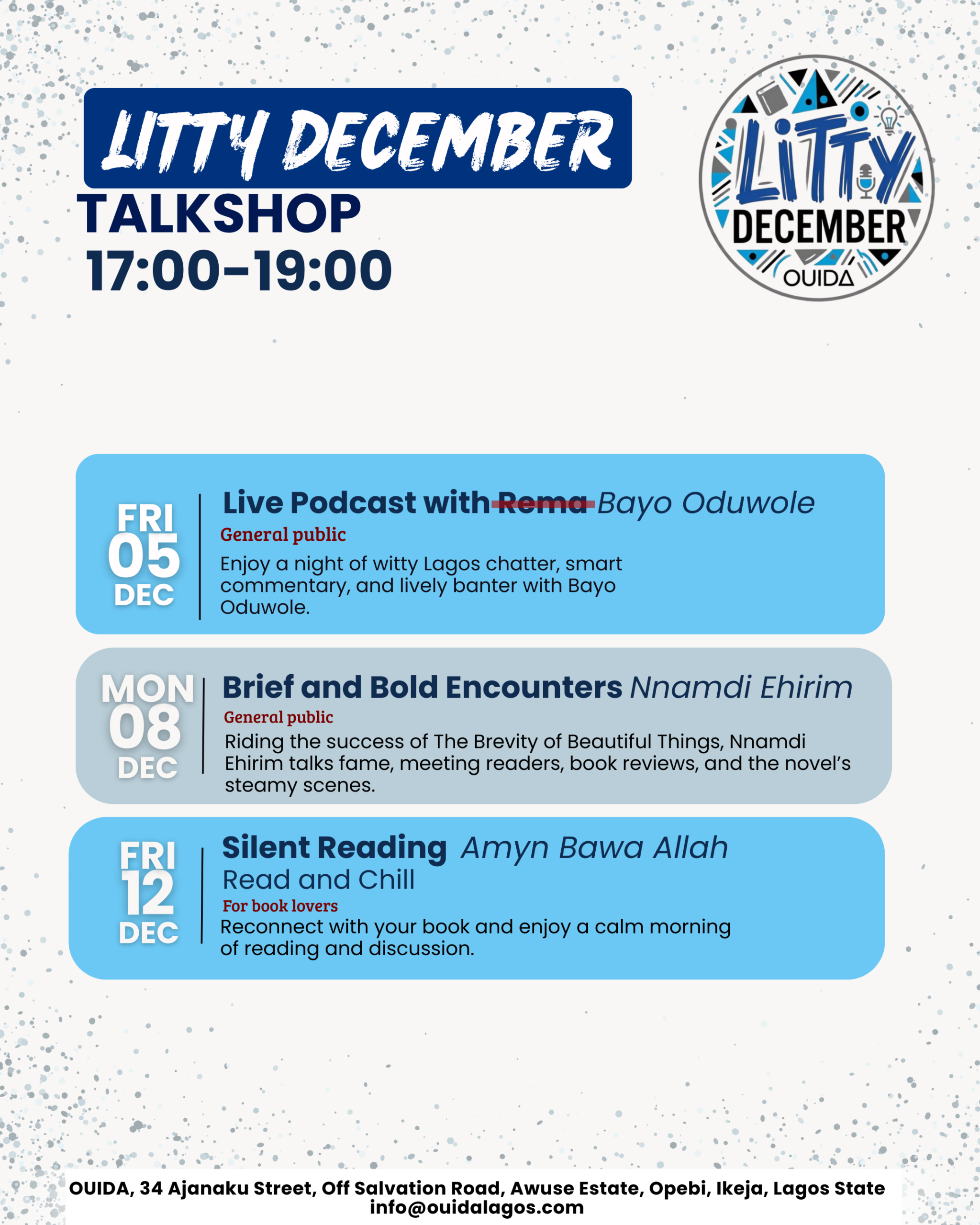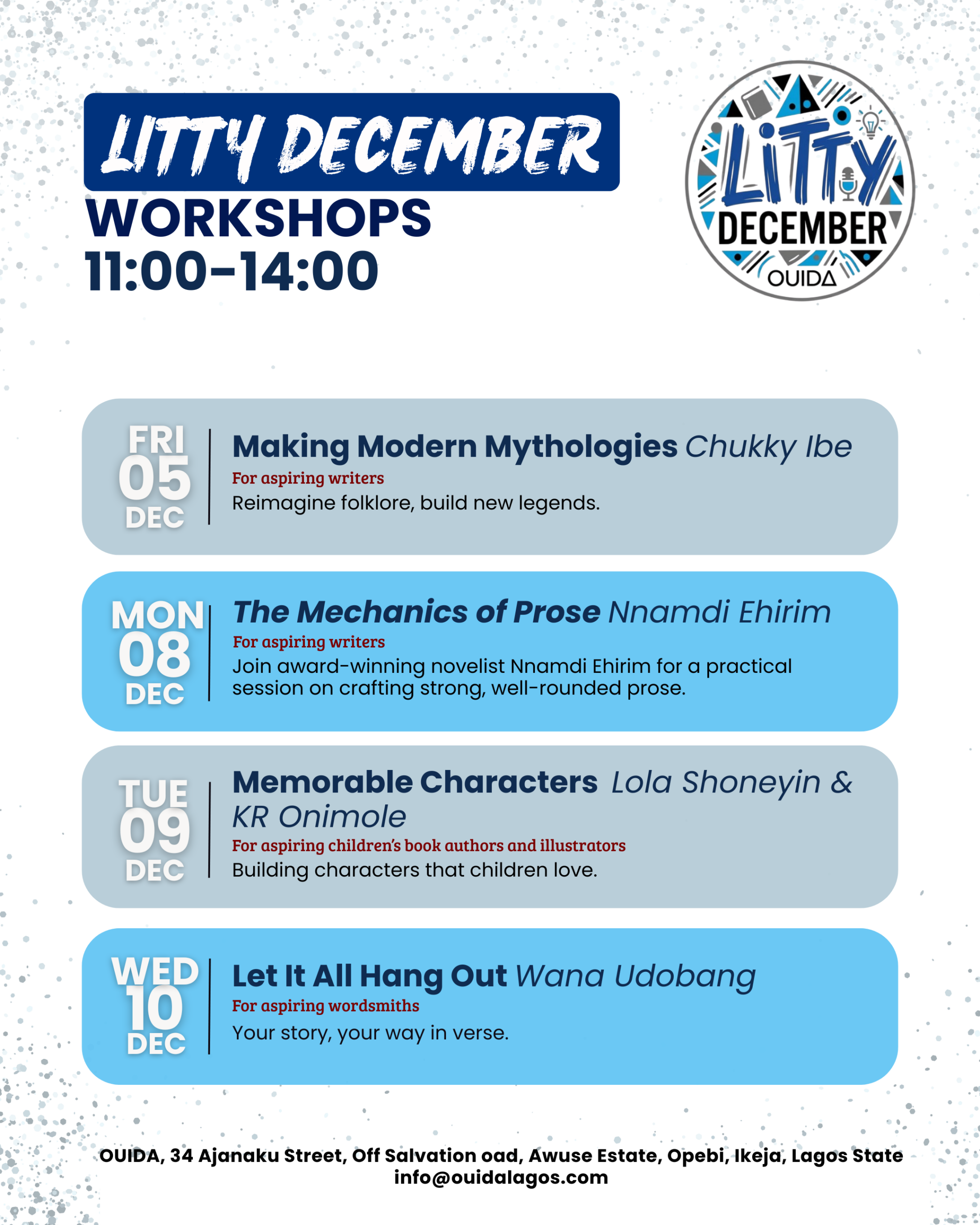Ouida House 34 Ajanaku street Off Salvation Road,, Opebi, Lagos, NigeriaLet It All Hangout Description: Writer and poet Wana Udobang brings her emotional depth and understanding to Litty December. Expect tips on expressing emotional intensity in writing whilst crafting well defined narratives. Facilitator: Wana Udobang Audience: Aspiring writers