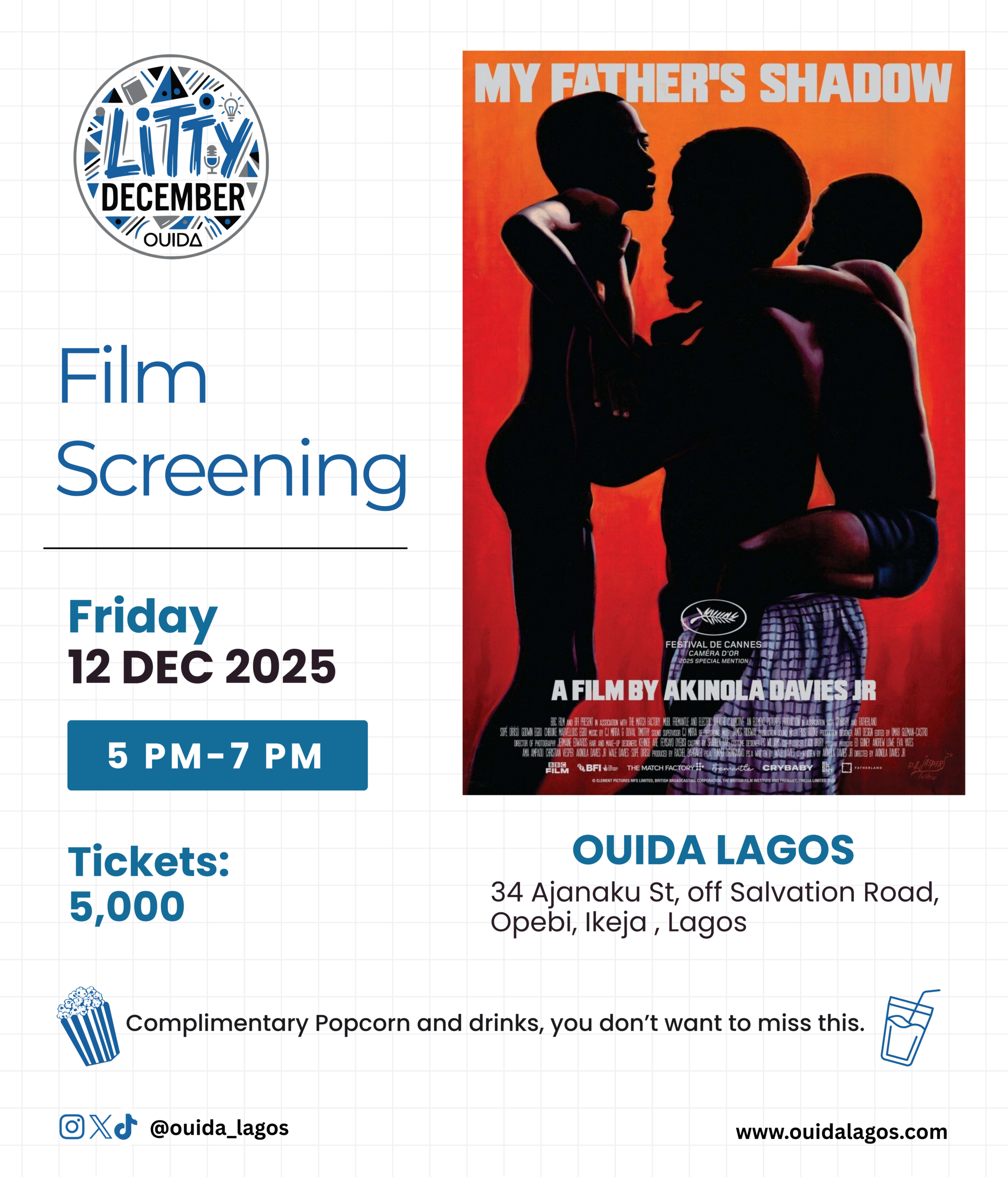 Ouida House 34 Ajanaku street Off Salvation Road,, Opebi, Lagos, NigeriaFilm Screening Description: My Father’s Shadow Description: The award winning My Father’s Shadow visits Ouida followed by a chat with the producers. Audience: Public