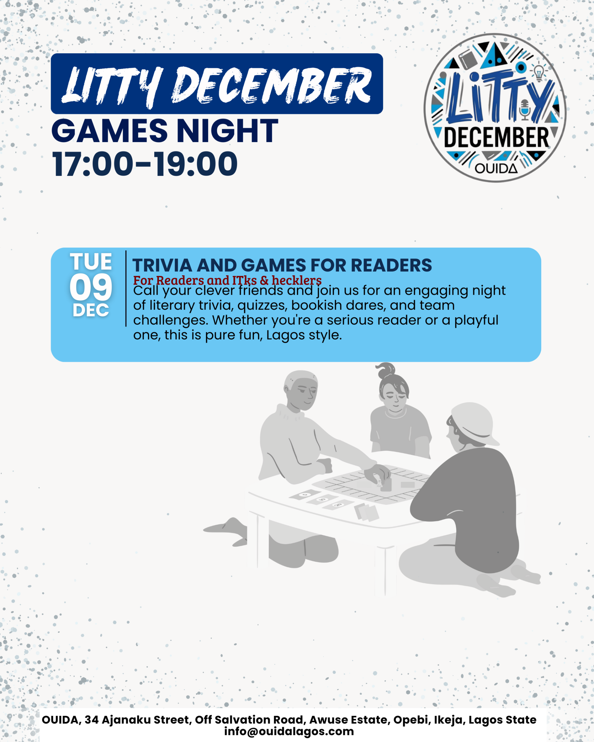 Ouida House 34 Ajanaku street Off Salvation Road,, Opebi, Lagos, NigeriaGames Night Description: Trivia and Games for Book Lovers Call your clever friends and join us for an engaging night of literary trivia, quizzes, bookish dares, and team challenges. Whether you're a serious reader or a playful one, this is pure fun, Lagos style. Facilitator: Sharon Adeoye-Ajanlekoko Audience: Book lovers, Public