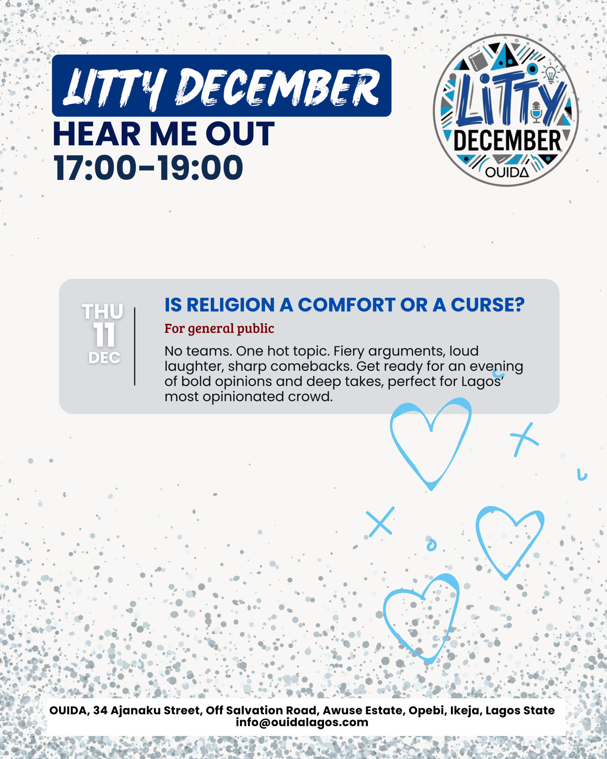 Ouida House 34 Ajanaku street Off Salvation Road,, Opebi, Lagos, NigeriaHear Me Out Description: Is Religion in modern day Nigeria a comfort or a curse? Description: No teams. A hot topic. Fiery arguments. Loud laughter. Sharp comebacks. Get ready for a lively evening of profound opinions and deep takes in a no-judgement zone! Perfect for Lagos’ opinionated crowd. Audience: Book lovers, Public