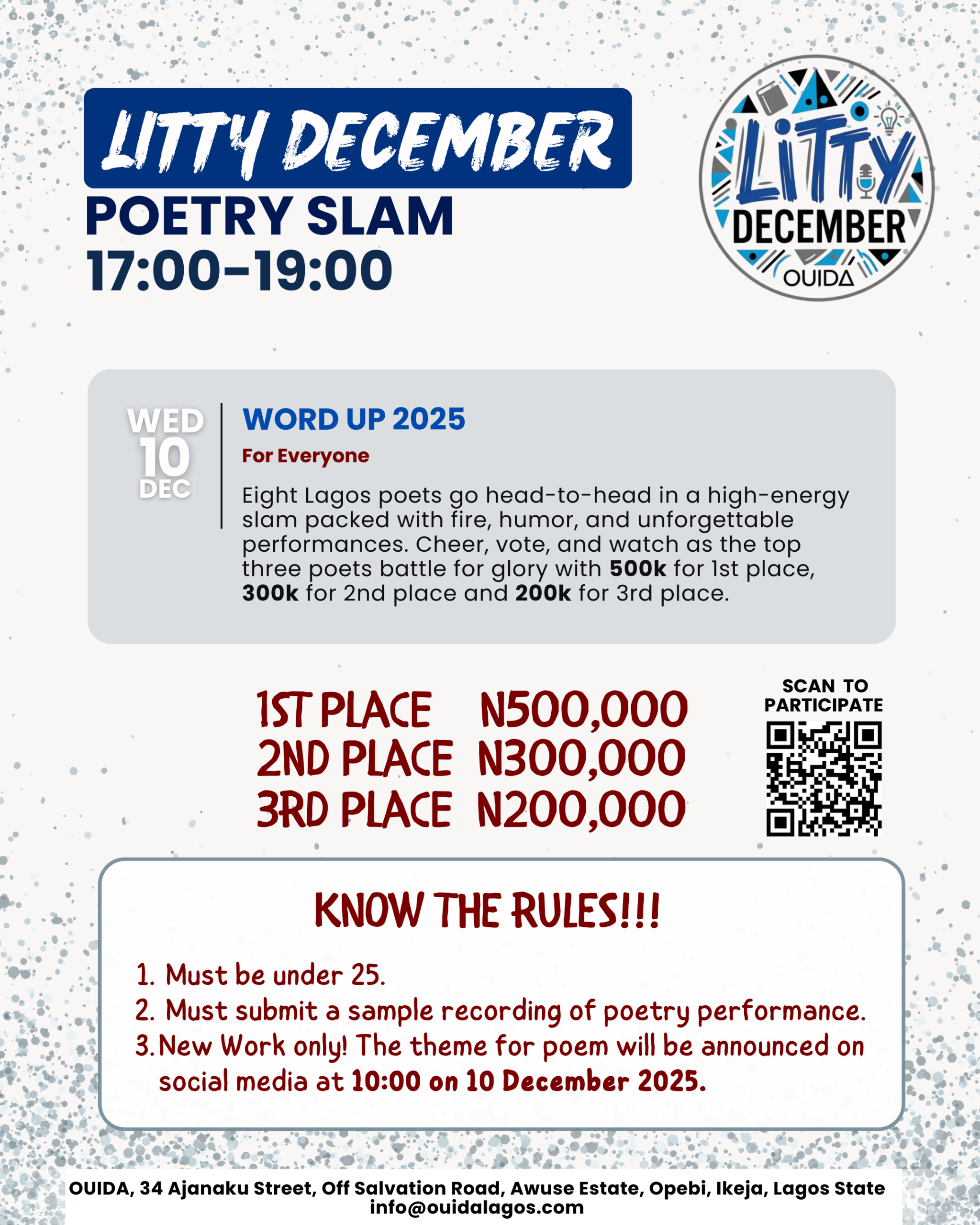Ouida House 34 Ajanaku street Off Salvation Road,, Opebi, Lagos, NigeriaWord Up 2025 Description: Eight Lagos poets face off in a high-energy slam filled with fiery verses, humour, heartbreak, and unforgettable performances. Come cheer, vote, and witness one the city’s brightest voices walk away with N1m. Jury: Wana Udobang, Lola Shoneyin