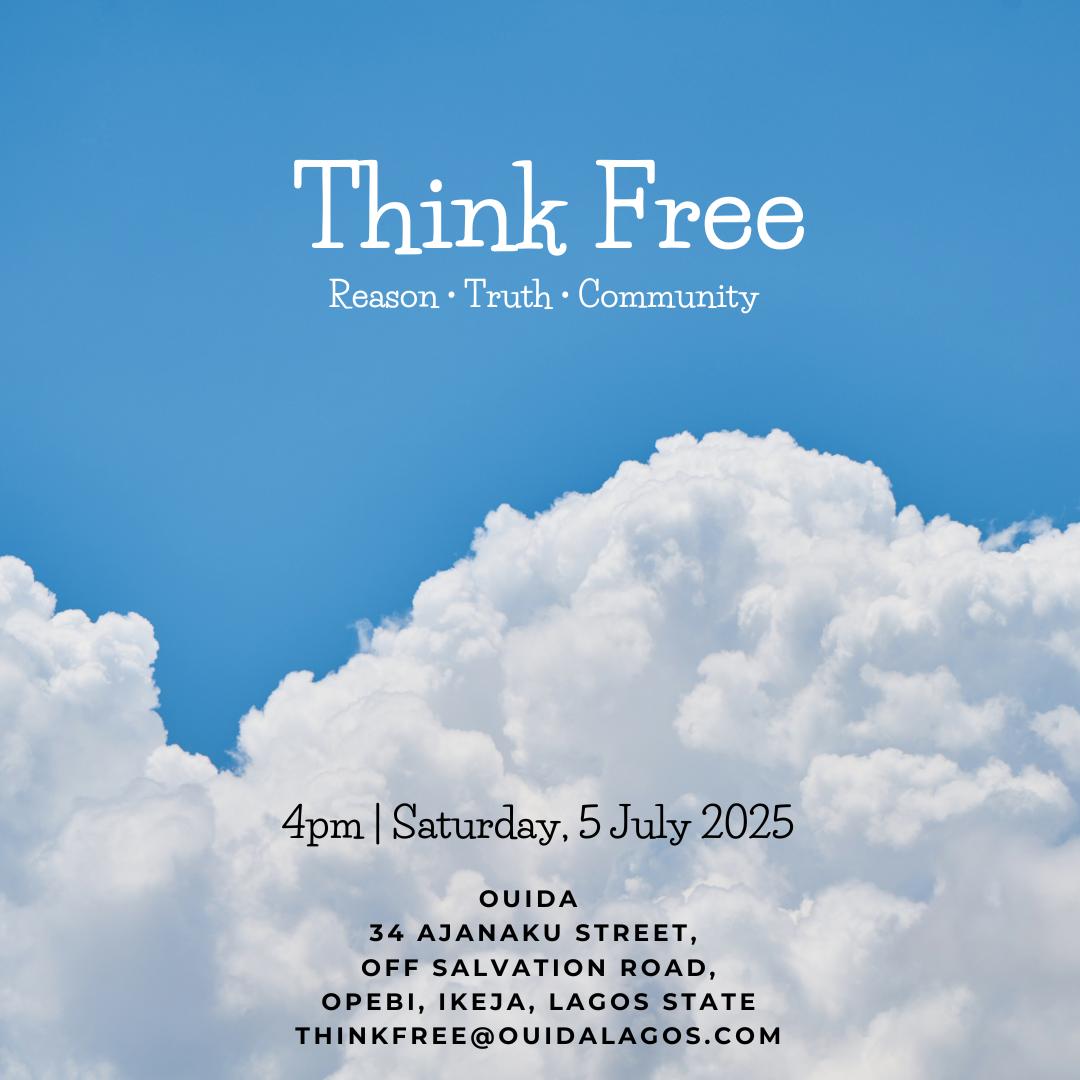 Ouida House 34 Ajanaku street Off Salvation Road,, Opebi, Lagos, NigeriaWe are super excited to invite you to our next Think-Free gathering which will take place on Saturday 5th July, 2025 at 4:00 pm. This is gathering for Humanists who hold the belief that it is possible for human beings to live happy, functional and fulfilling lives without the intervention of organised or traditional religion. We look forward to welcoming you.