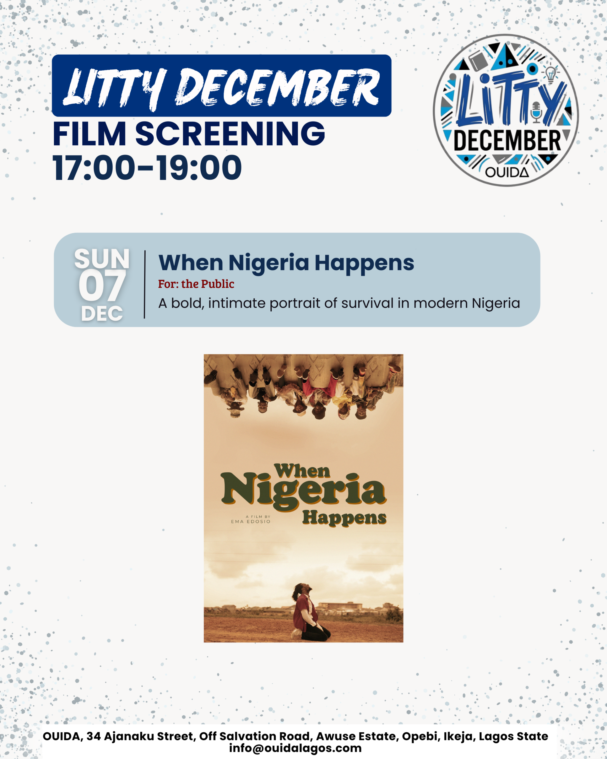 Ouida House 34 Ajanaku street Off Salvation Road,, Opebi, Lagos, NigeriaWhen Nigeria Happens Description: Screening and intimate conversations with the director, the writer and cast. Audience: Public