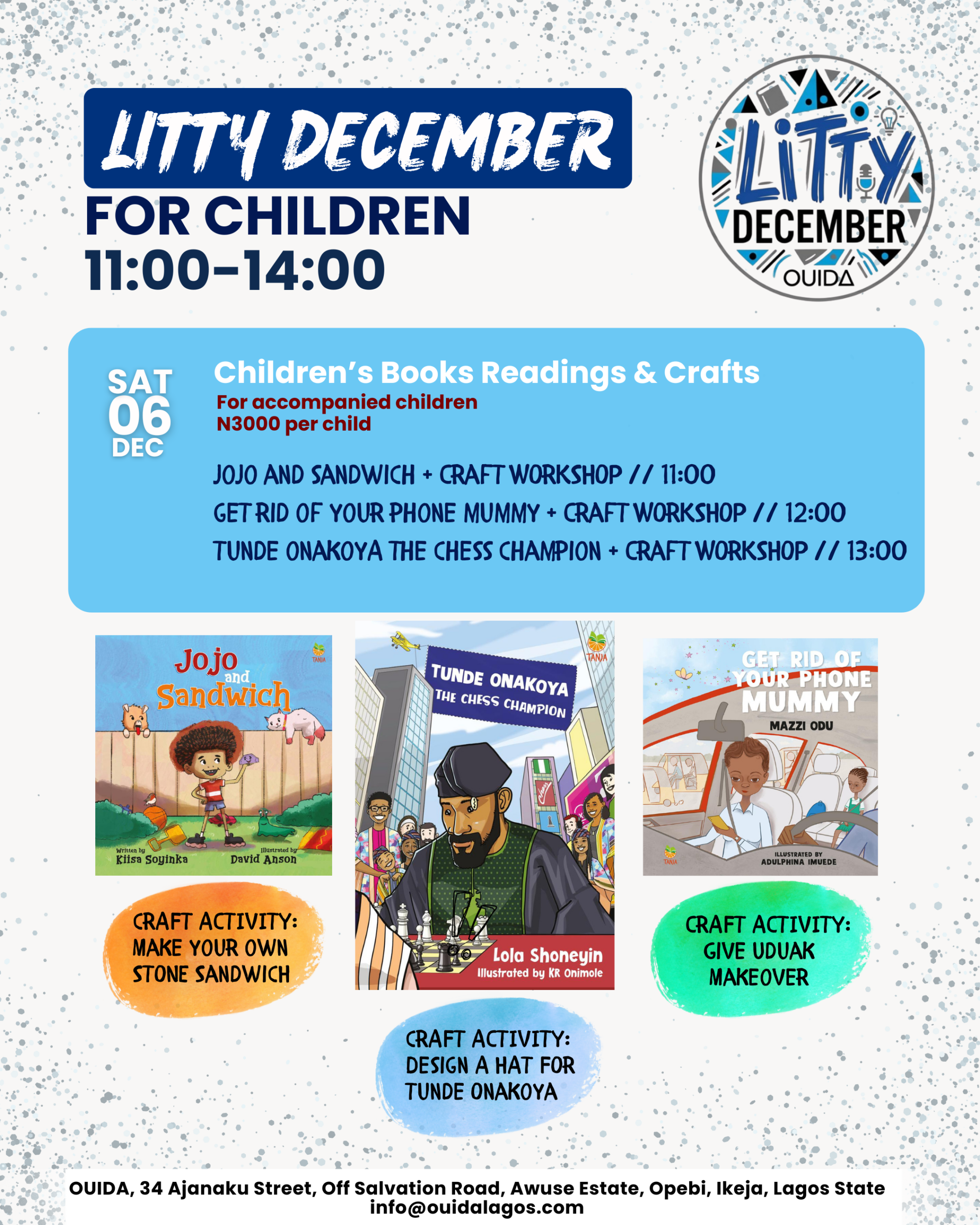 Ouida House 34 Ajanaku street Off Salvation Road,, Opebi, Lagos, NigeriaBook Meet Children’s Books Readings & Craft Fair Description: A magical day for kids filled with readings, fun activities and storytelling. Children will get the chance to meet children’s book authors and get new books for Christmas presents. Audience: Children, Parents, Public
